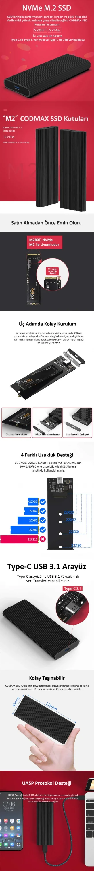 Codegen Codmax CDG-SSD-10BC, NVMe M.2 SSD’leri harici belleğe dönüştürmek isteyen kullanıcılar için yüksek hızlı ve güvenilir bir çözümdür. USB 3.1 Gen 2 Type-C bağlantı noktası ile 10 Gbps’ye kadar veri aktarım hızına ulaşabilir, büyük dosyaları saniyeler içinde taşıyabilirsiniz.