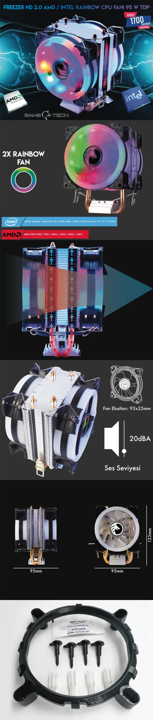 Gametech Freezer HD 2.0 AMD / INTEL Rainbow CPU Soğutucu 95 W TDP