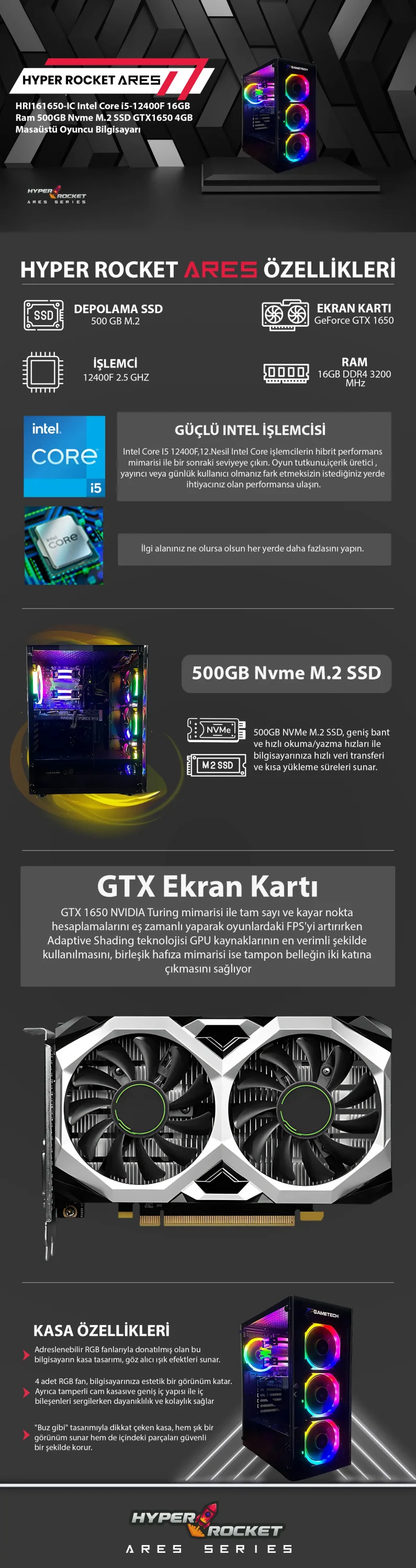 HYPER ROCKET Ares HRI161650-IC Intel Core i5-12400F 16GB RAM 500GB NVMe M.2 SSD GTX 1650 4GB Masaüstü Oyuncu Bilgisayarı