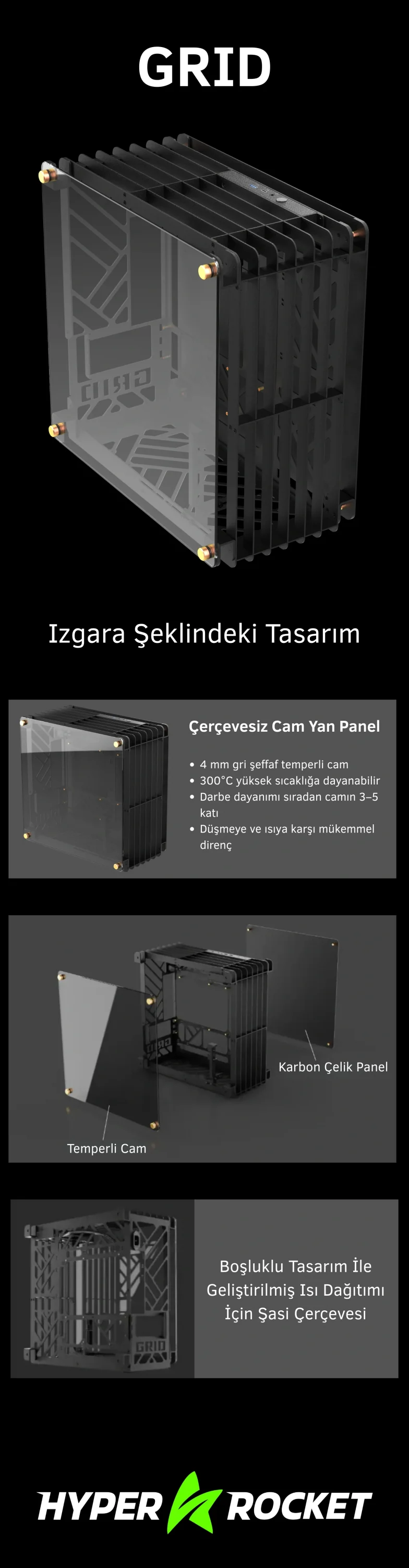 Hyper Rocket GRID, açık şasi (open frame) yapısı ve güçlendirilmiş metal karkasıyla kompakt sistem toplamak isteyen kullanıcılar için tasarlanmış modern bir gaming oyuncu kasasıdır. Kapalı yüzeylerin minimumda tutulduğu açık tasarım, bileşenlerin ürettiği ısının serbest şekilde dışarı atılmasına imkân tanıyarak daha stabil bir termal yapı oluşturur.
