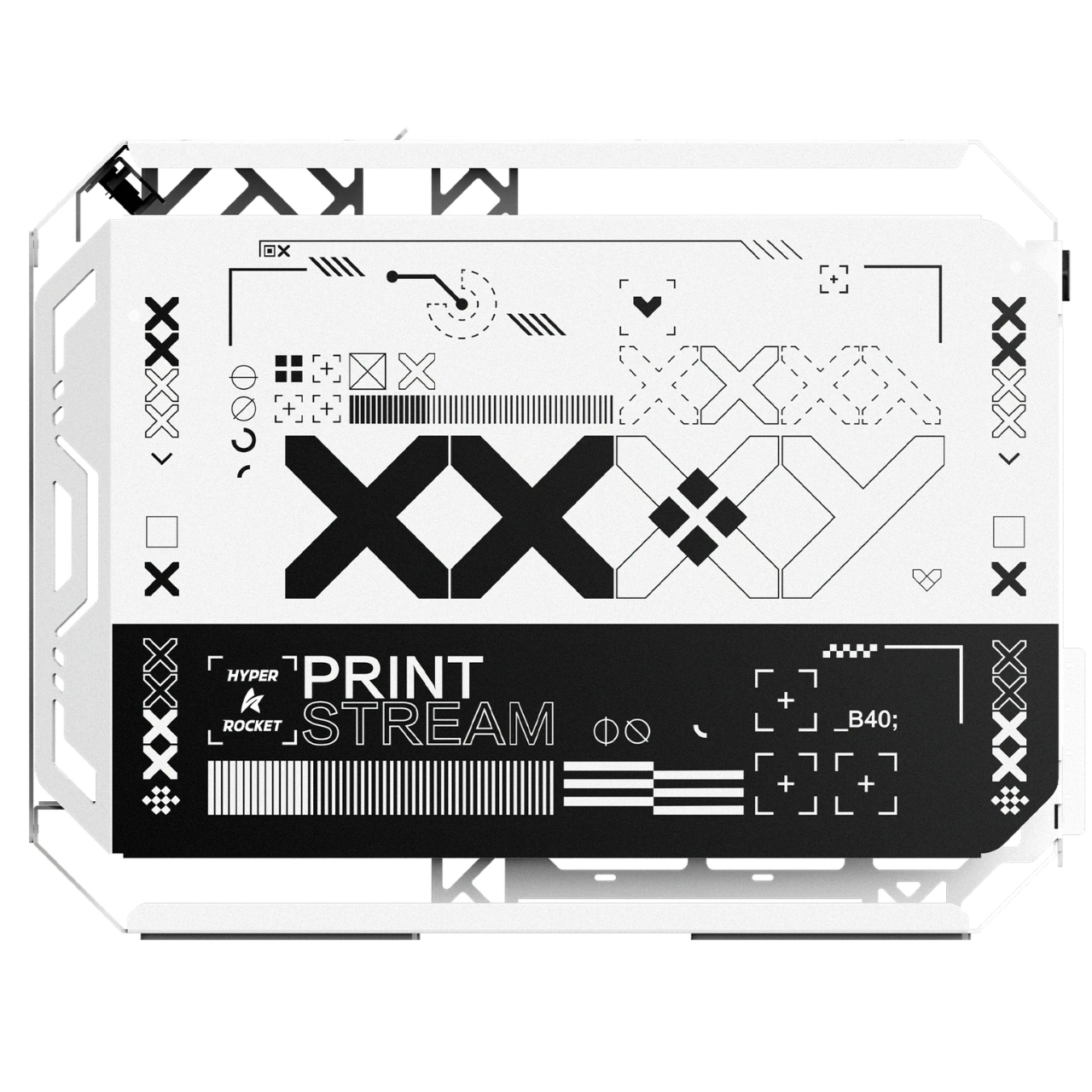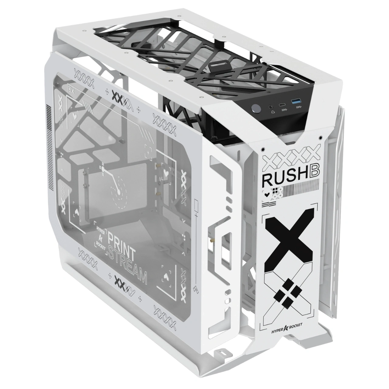 Hyper Rocket X-ERA Print Stream, açık çerçeveli (open frame) tasarımıyla hava akışını serbest bırakan ve donanımı ön planda sergileyen modern bir oyuncu kasasıdır. “X” formundan ilham alan keskin geometriler, dış yüzeydeki güçlü çerçeve yapısıyla birleşerek masaüstünde dikkat çeken dinamik bir görünüm oluşturur.