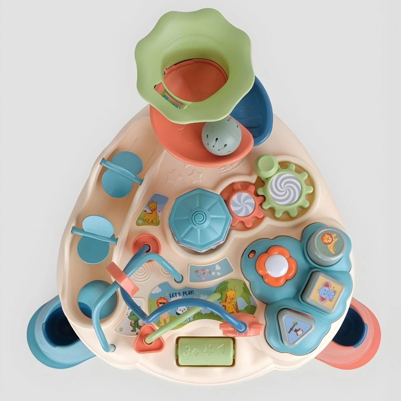 Masa oyun topu, mekanik aktiviteler, boncuk oyunu, dönen dişliler, hayvan sesleri