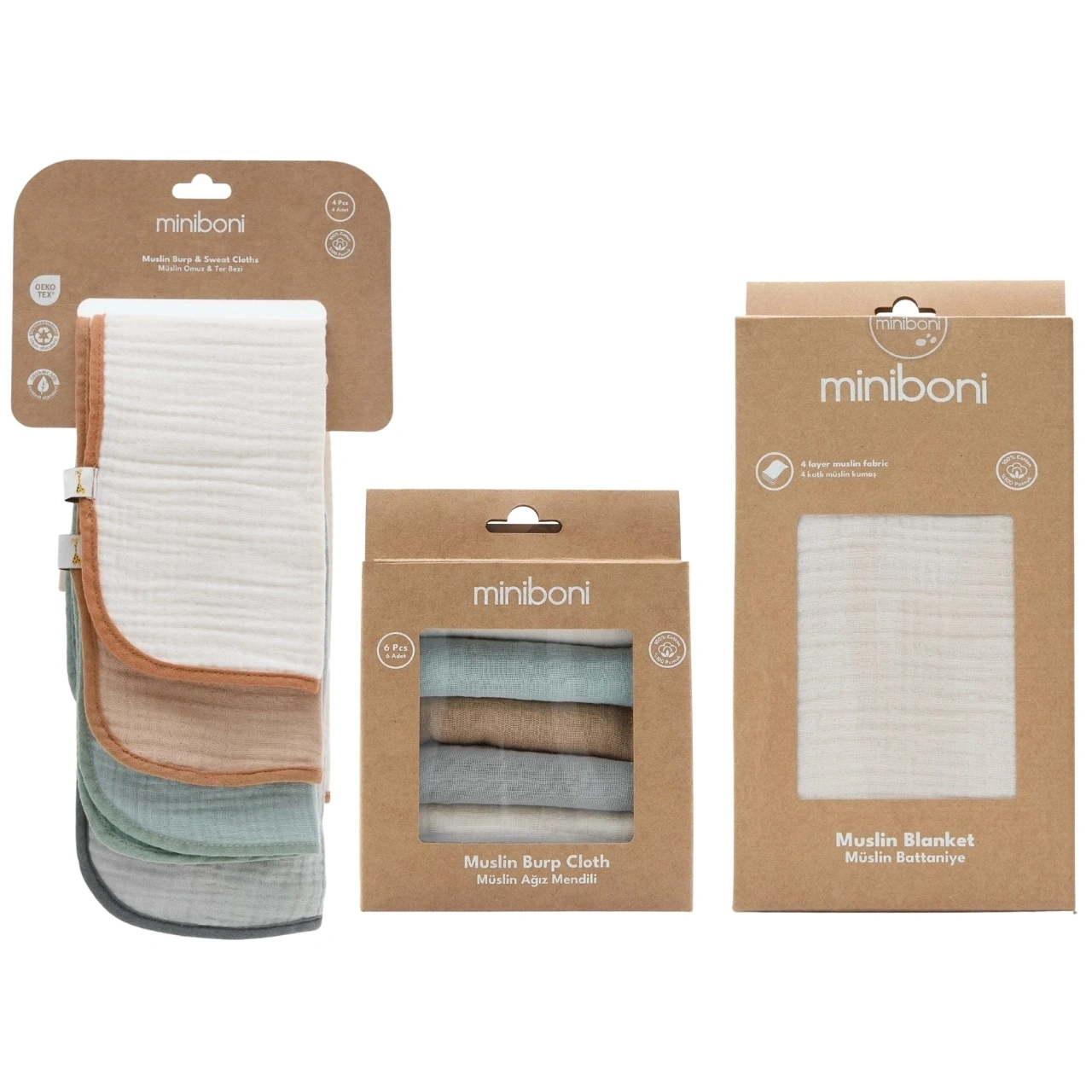 Miniboni Müslin Set, bebeğinizin doğumdan itibaren günlük ihtiyaçlarını tek pakette buluşturan, annelerin en çok kullandığı müslin ürünlerden oluşur. %100 doğal pamuk müslin kumaşı sayesinde nefes alır, terletmez ve hassas ciltler için güvenle kullanılabilir.