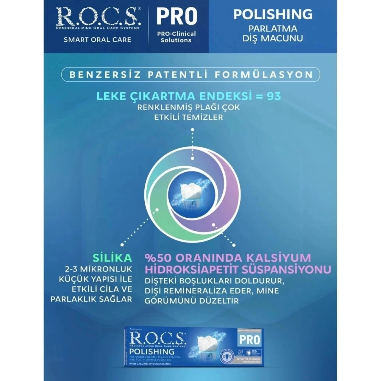 Haftalık bakım için geliştirilen R.O.C.S. PRO Polishing Parlatıcı Cila Macunu, mikro silikon dioksit tanecikleri sayesinde diş minesini cilalayarak daha parlak ve pürüzsüz bir görünüm kazandırmaya yardımcı olur. Kalsiyum hidroksiapatit ve mineral içerikleri ile diş yüzeyinin daha homojen ve bakımlı görünmesini destekler.