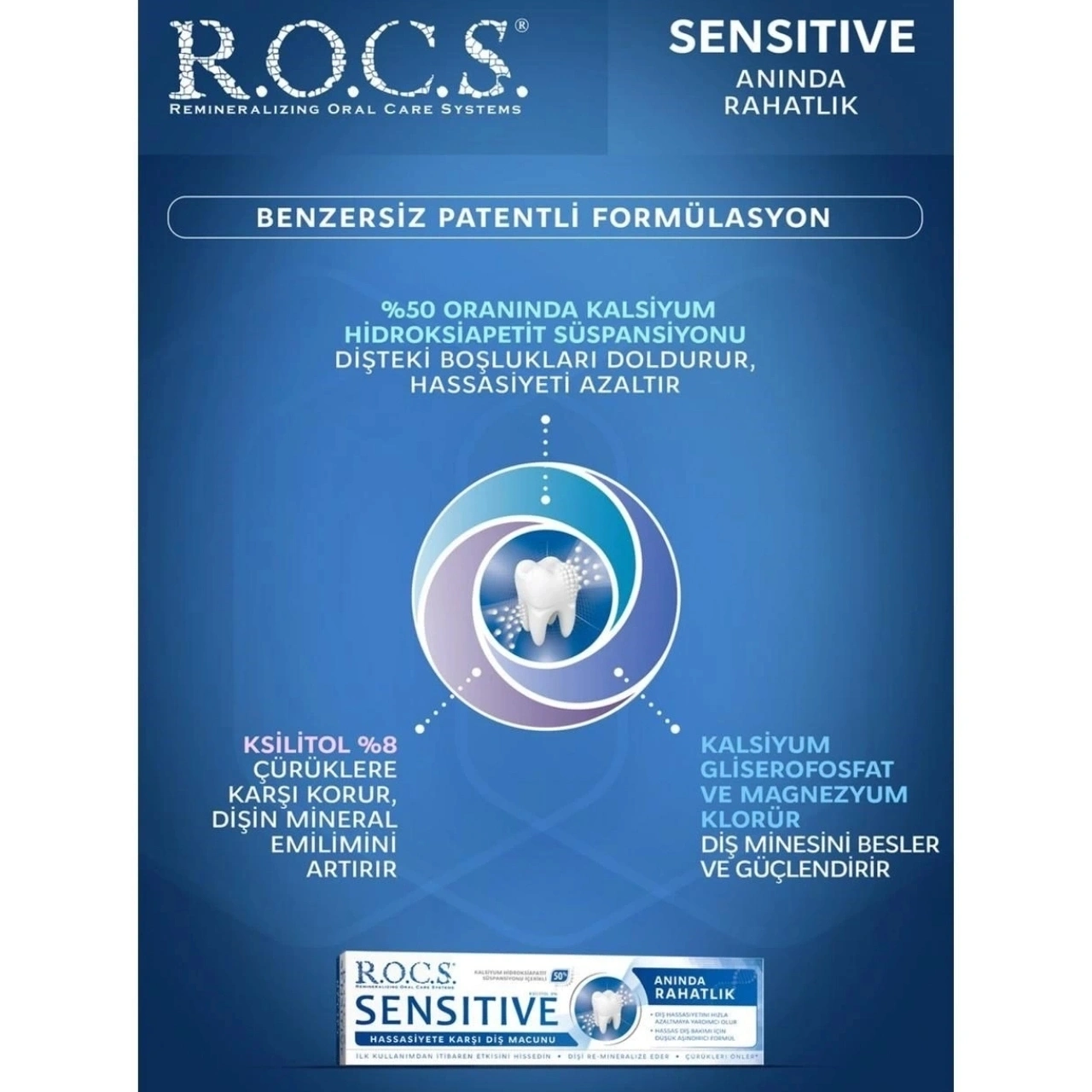 R.O.C.S. Sensitive Repair & Whitening Diş Macunu ise hassas dişlere sahip yetişkinler için özel olarak formüle edilmiştir. Kalsiyum hidroksiapatit içeriği sayesinde diş minesindeki hassasiyet kaynaklı mikro hasarların onarılmasına destek olur. Günlük kullanıma uygun yapısı ile diş minesini aşındırmadan temizlik sağlarken, beyazlatıcı etkisiyle daha bakımlı ve sağlıklı bir gülümsemeye katkıda bulunur.