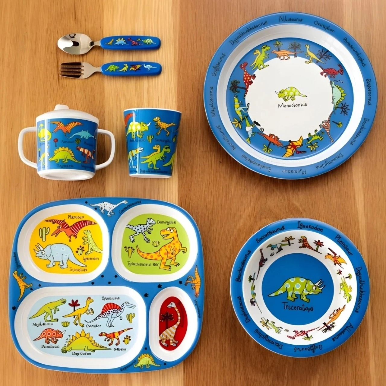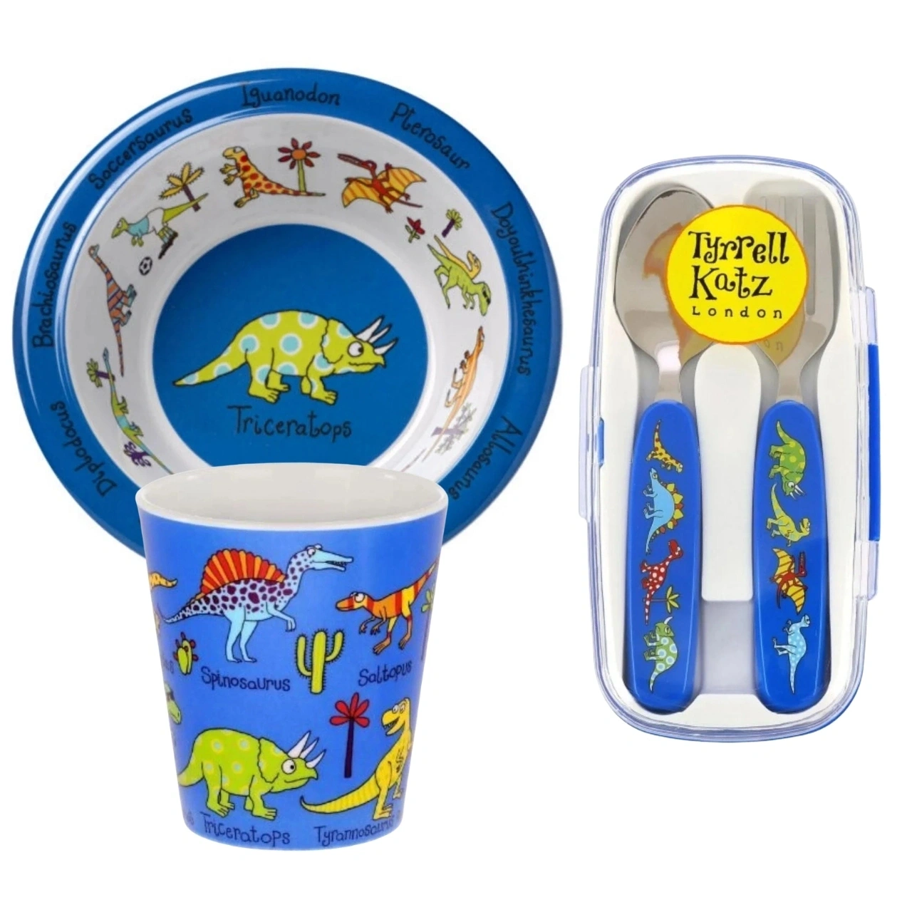 Tyrrell Katz Melamin Mama Kasesi - Alıştırma Bardağı - Kutulu Çatal Kaşık Seti // Dino